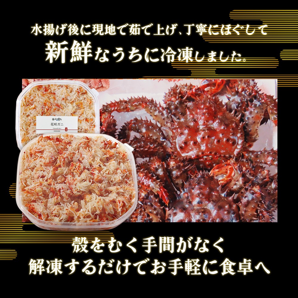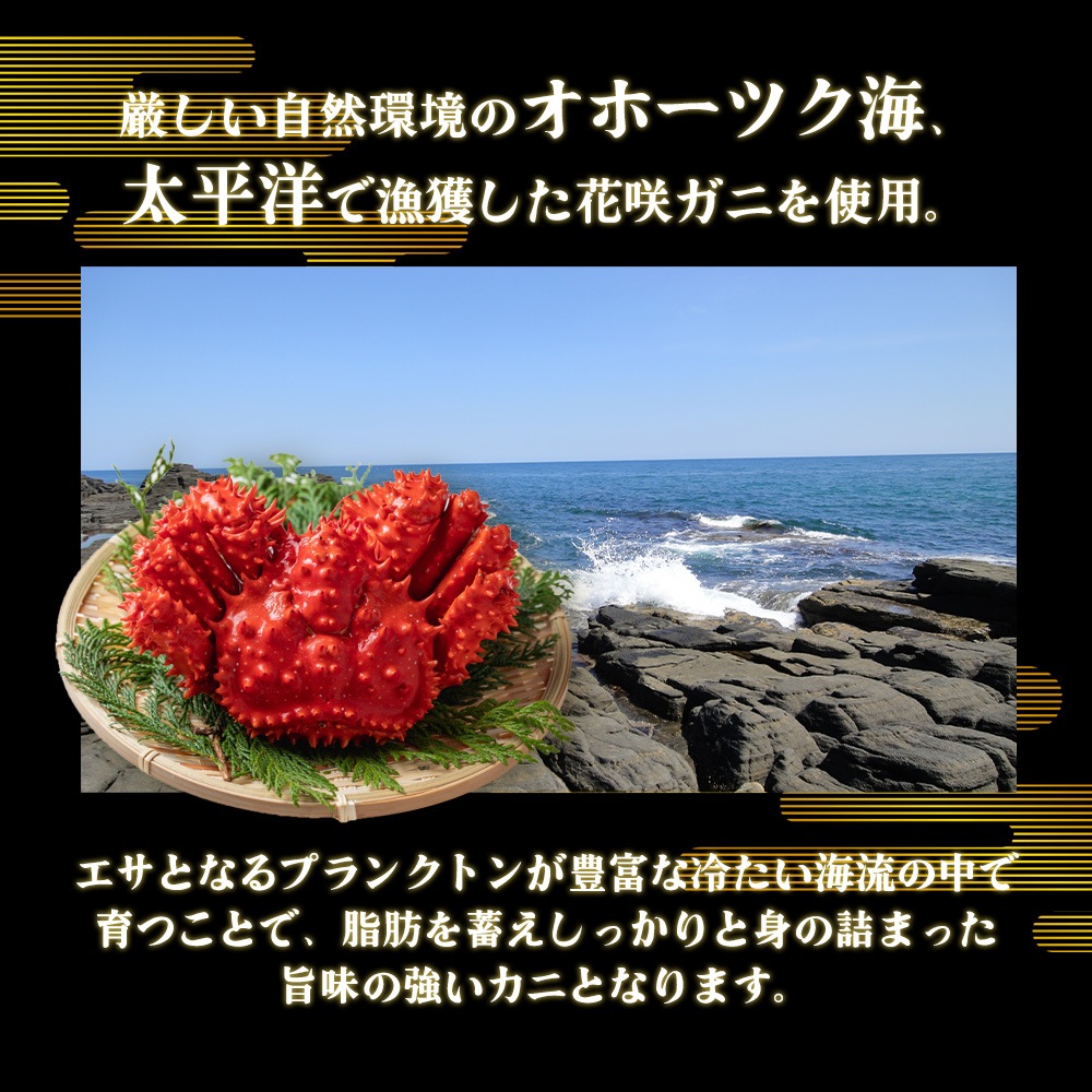 オホーツク海、太平洋で漁獲した新鮮な花咲ガニを現地で茹で上げ、丁寧にほぐして新鮮なうちに冷凍しました。
