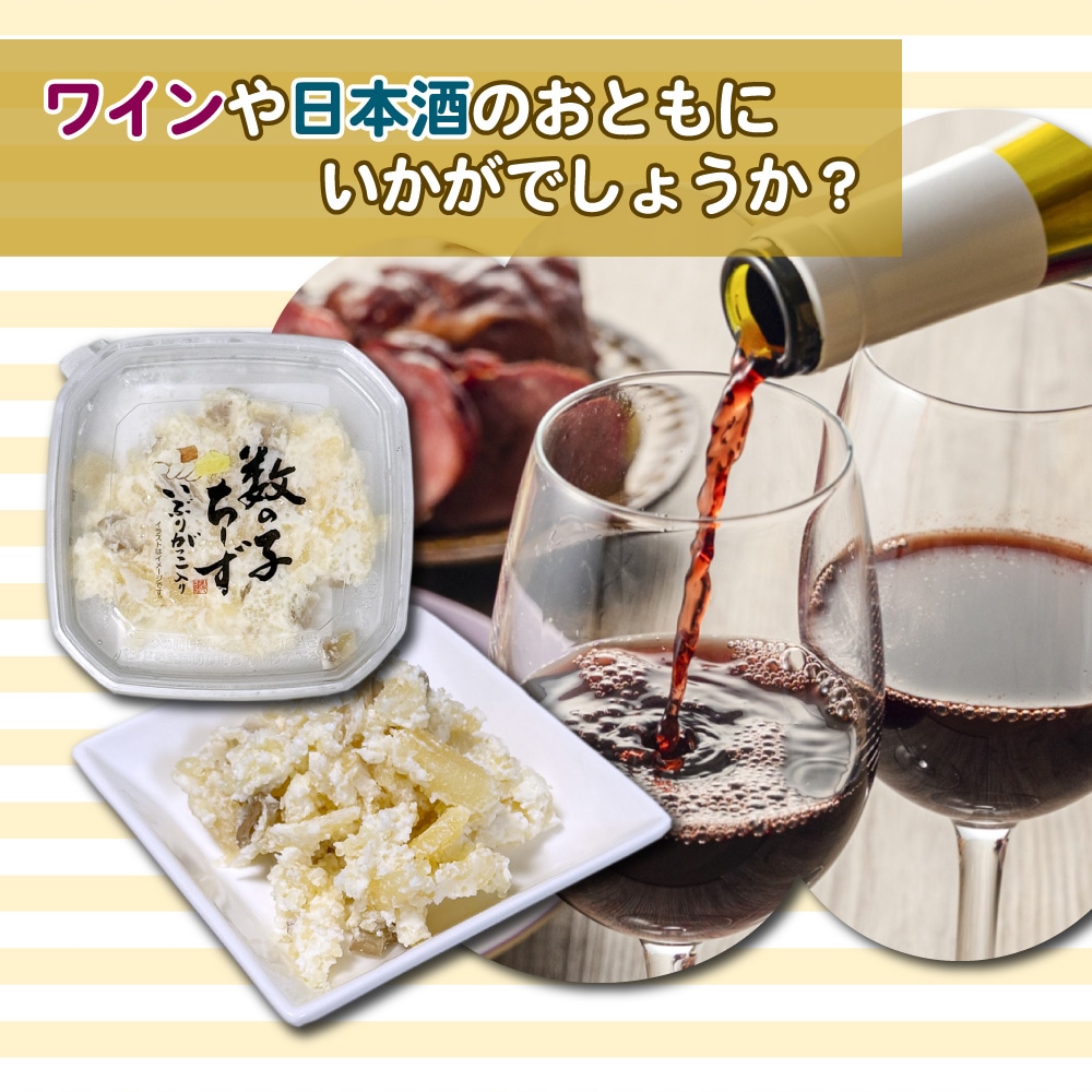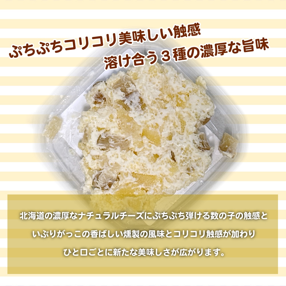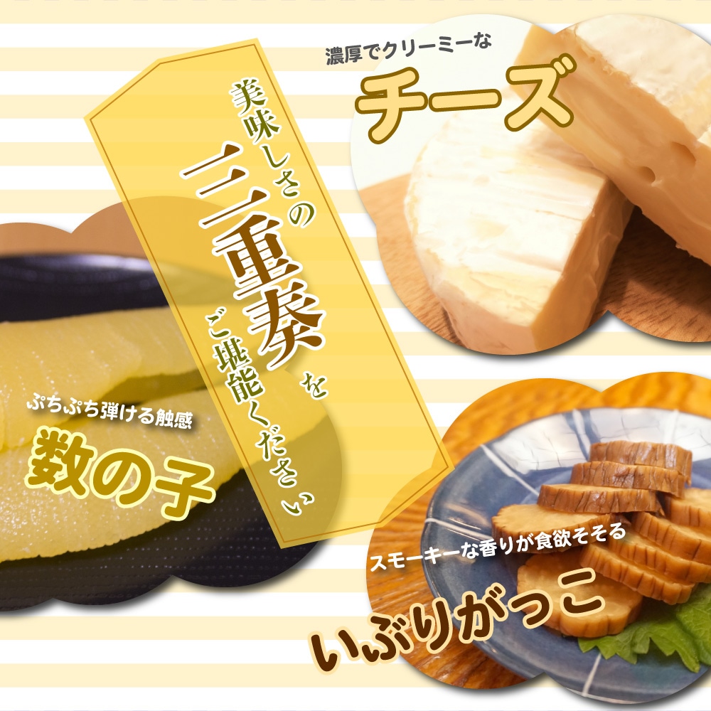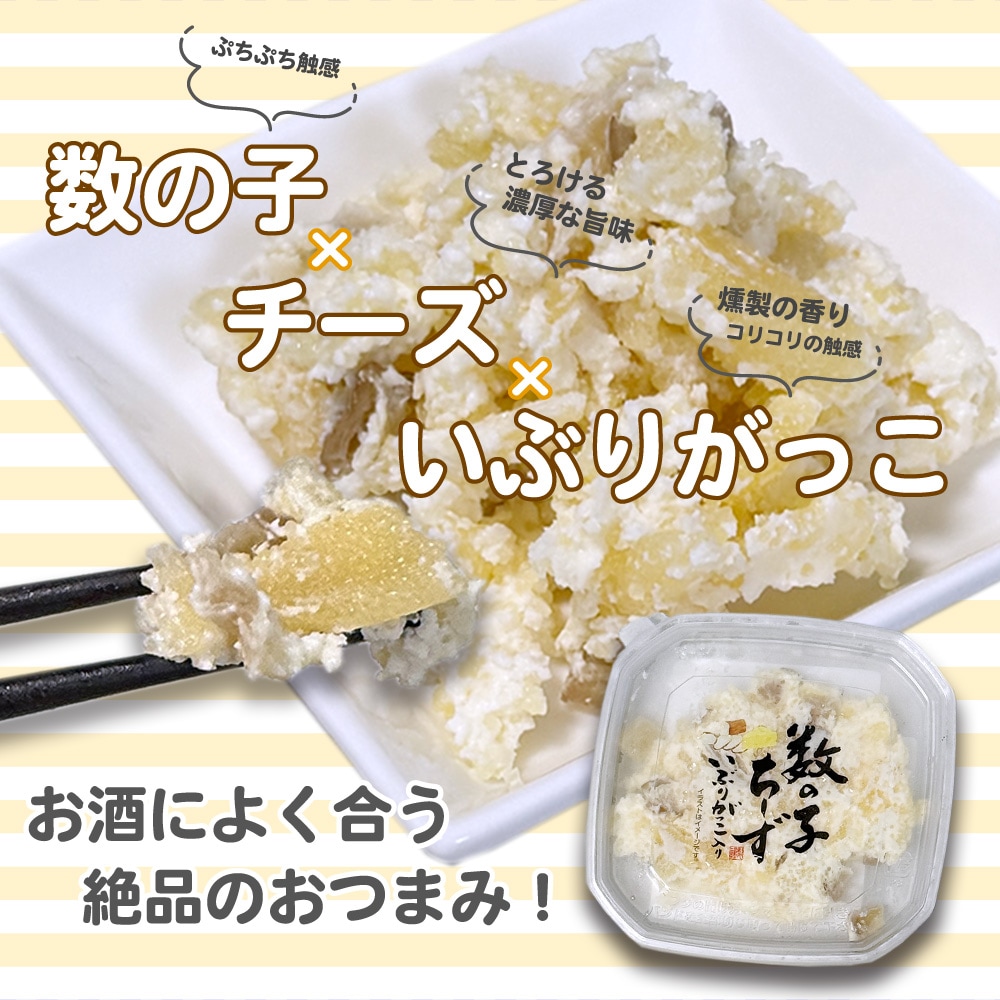 北海道産チーズに細かく刻んだ数の子と秋田名物いぶりがっこを贅沢に練り込み、クリーミーでぷちぷち&コリコリの食感が楽しめる絶品おつまみです。